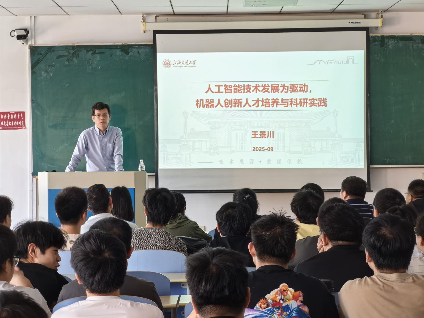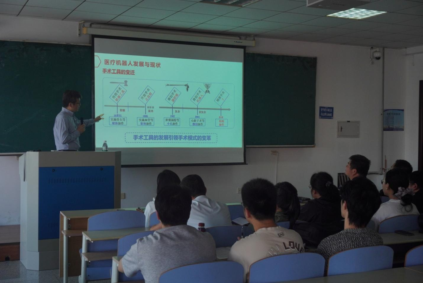 此次讲座有机器人工程专业本科生、机器人相关课题研究生,及机械电子工程系、机器人研究相关教师参会。王景川以“人工智能技术发展为驱动,机器人创新人才培养与科研实践”为题,采用深入浅出、图文并茂的方式,从五方面展开分享:一是智能机器人发展与AI 赋能,二是人工智能技术浅析,三是人工智能背景下教育教学的机遇与挑战,四是机器人教学—以综合项目驱动创新能力培养,五是机器人科研实践—从移乘到仿人到场景。